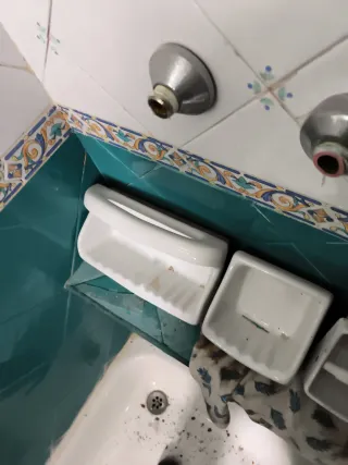 Conjunto de apliques antiguos para baño, con detalles en cerámica y metal. - Diseño clásico. - Combinación de colores blanco y verde azulado. - Piezas decorativas para el hogar.