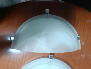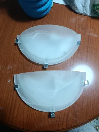 Conjunto de dos lámparas de pared con un diseño moderno y elegante. - Fabricadas en cristal translúcido con vetas blancas. - Soportes metálicos plateados. - Forma semicircular. - Dos lámparas