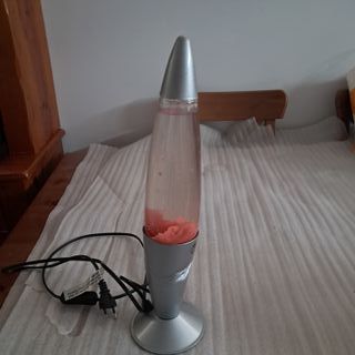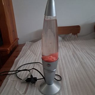 Lámpara de lava con un diseño clásico y llamativo. La base y la tapa son de color plateado, y el líquido interior es transparente con burbujas rosas. La base se daño por el calor pero funciona perfectamente No dispone de bombilla - Altura aproximada: 30 cm. - Base y tapa de plástico. - Botella de cristal.