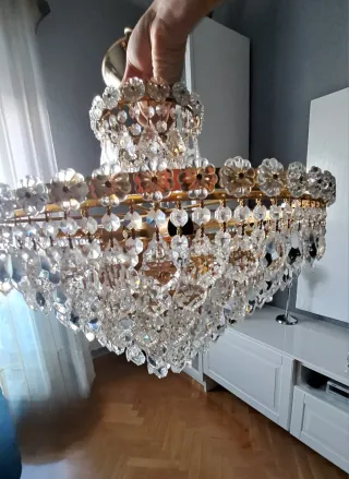 Elegante lámpara de techo con un diseño clásico y lujoso - Estructura principal en metal dorado. - Detalles decorativos en forma de flor. - Múltiples cristales colgantes que refractan la luz. - Gran luminosidad. - Se regalan producto especial de limpieza para su óptima conservación - 2 unds. Disponibles - Precio por unidad. - Diámetro 50cm altura 45 Las 2 unds. 80€