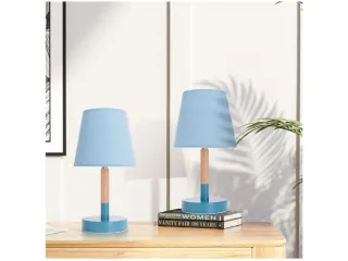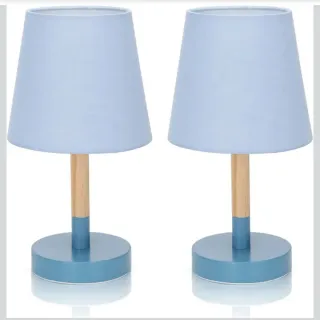 Set de dos lámparas de mesa con un diseño moderno y elegante. Perfectas para añadir un toque de luz y estilo a cualquier habitación. - Pantallas de tela en tono azul claro. - Base y poste de madera con detalles en azul. - Base redonda y estable.