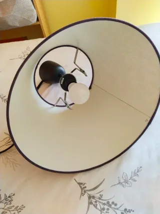 Lámpara de mesilla de noche. Con pie de cerámica color beige al igual que la pantalla con un tono más oscuro. Lámpara de enchufe, pero con encendido y apagado mediante botón como se puede ver en foto. Cualquier duda pregunta. Tengo dos por 10€.