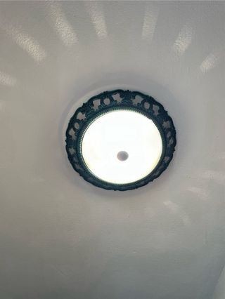 Conjunto de dos lámparas de techo con un diseño decorativo. - Marco exterior con detalles ornamentales. - Cubierta de cristal esmerilado. - Cada lámpara tiene un punto central decorativo.