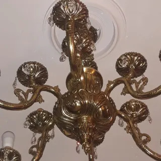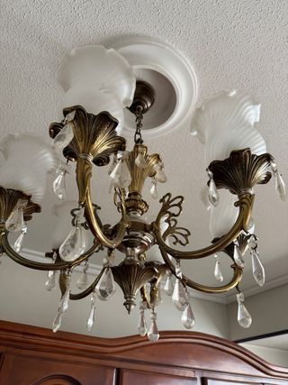 Elegante lámpara de araña de estilo vintage, con un diseño que combina metal dorado y detalles de cristal. - Estructura principal de metal con acabado dorado. - Colgantes de cristal tallado. - Diseño de múltiples brazos con portalámparas.