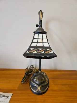 Elegante lámpara de mesa con un diseño clásico. Tiffany Original Una pieza de cristal tiene una raja (última foto) - Pantalla de cristal con detalles en blanco y marrón. - Base y estructura de metal con acabado envejecido. - Estilo artístico y decorativo.