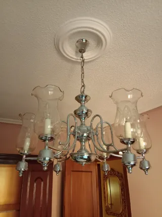 Elegante lámpara de araña con un acabado plateado brillante y detalles en cristal. - Diseño de seis brazos. - Tulipás de cristal con borde ondulado. - Cadena para colgar ajustable.