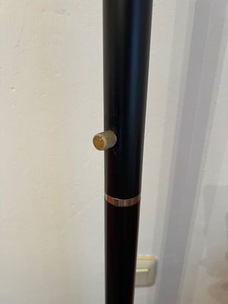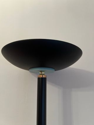 Elegante lámpara de pie con un diseño moderno. - Acabado en negro y detalles dorados. - Fabricada con materiales de metal y plástico. -Recogida y transporte a cargo del comprador