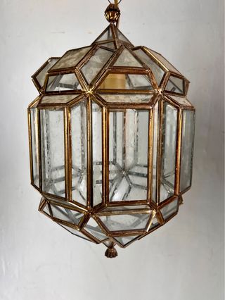 Elegante lámpara de estilo Granadino con una estructura geométrica. Lleva años descolgada, muy buen estado de conservación, están todos los critales sin roturas. Necesita un limpieza a fondo. 44cm de alto aprox sin contar la cadena. 25cm de ancho aprox. Por favor observen bien las fotografías. Cualquier duda pregúnteme sin compromiso.