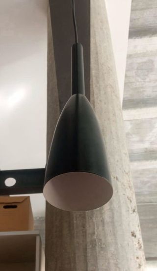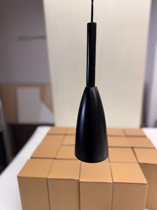 Lote de 20 lámparas de suspensión con un diseño moderno. Lote completo 20 ud 190 € Unidades sueltas. 12 € Dimensiones. Pantalla metalica 19,5 x 10 cm. Prolongador negro (opcional colocar) 15 cm. Floron 9,5 x 2 cm. Longitud cable a sumar a pantalla 95 cm. Casquillo E27 - Color principal: negro. - Acabado interior: Blanco