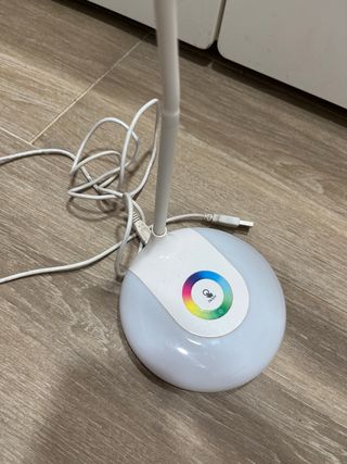 Lámpara de escritorio con base circular y brazo flexible. Permite cambiar entre diferentes colores y modos de iluminación. - Control táctil en la base. - Puerto USB para alimentación. - Diseño moderno y adaptable.