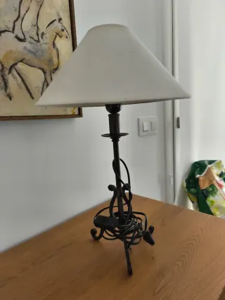 Lámpara de mesa con: - Base y estructura de hierro. - Pantalla de tela en tono beige. -Altura 30cm