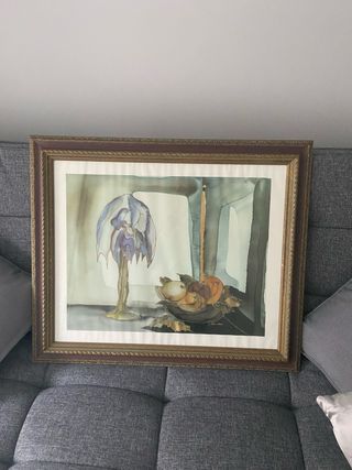 Preciosa pintura estilo bodegón. Se presenta enmarcada en madera oscura con detalles dorados. - Representa una lámpara de estilo art déco y una cesta con frutas. - La técnica pictórica parece acuarela sobre papel. - El marco está en buenas condiciones, mostrando un diseño elegante.