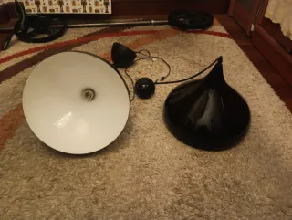 Se venden dos lámparas en una ,colgantes con un diseño moderno y elegante. - Color negro brillante. - Fabricadas en metal Están algo ralladas pero puestas apenas se aprecia