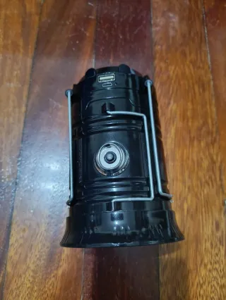 Lámpara portátil para camping con luz LED en perfecto estado. Ideal para acampadas, salidas al campo y iluminación en interiores. Se puede cargar mediante USB y luz solar. Tiene 2 modos de luz, tanto foco, como luz ambiental, teniendo distintos modos de potencia en el focal. Incluye cable USB para cargar.