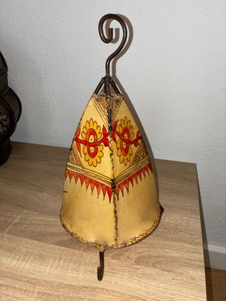 Bonita lámpara de estilo étnico con un diseño único. - Confeccionada en cuero y metal. - Detalles pintados a mano en tonos beige y rojo. - Colgante decorativo.