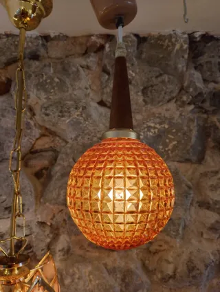 Elegante lámpara colgante de estilo vintage con una esfera de cristal texturizado. - Diseño esférico con acabado facetado. - Combinación de materiales que aportan un toque retro. - El color naranja del cristal crea una luz cálida y acogedora.