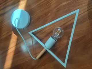 Lámpara de techo con un diseño geométrico y contemporáneo. Combina materiales para un acabado elegante. - Estructura principal en forma triangular. - Base circular para el techo. - Detalle en madera.