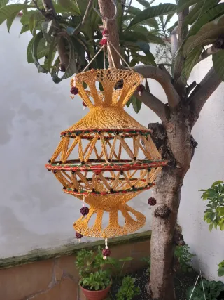 Preciosa lámpara colgante con un diseño único y llamativo. - Elaborada con fibras naturales. - Detalles en hilo de colores. - Aporta un toque bohemio y cálido a cualquier espacio.