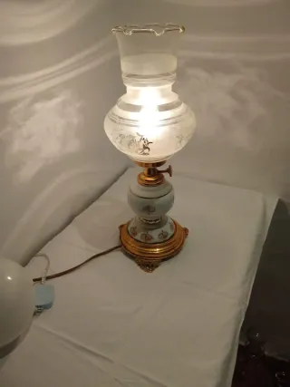 Hermosa lámpara vintage hecha en porcelana decorada y base dorada, con tulipa de cristal esmerilado y detalles florales. Funciona perfectamente y proyecta una luz suave y elegante, ideal para ambientar salas, dormitorios o espacios decorativos. Es una pieza clásica y decorativa, perfecta para quienes buscan un toque antiguo y refinado en su hogar.