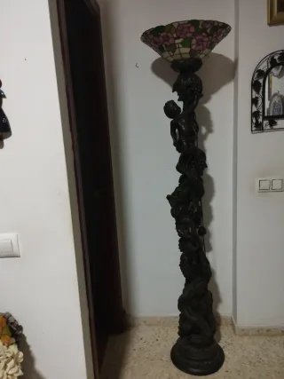 Elegante lámpara de pie con un intrincado labrado en su estructura. Su diseño único la convierte en una pieza decorativa destacada. - Altura aproximada de 1.80 metros. - Pantalla estilo Tiffany con detalles florales.