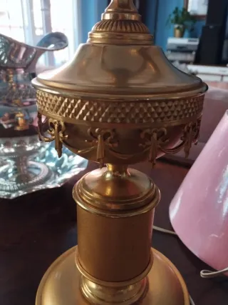 Elegante lámpara de mesa con base dorada y pantalla en tono rosa de el corte inglés( sin estrenar). - Base de metal con acabado dorado. - Pantalla cónica de cristal en color rosa.