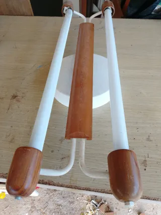 Elegante lámpara de techo con un diseño moderno que combina madera y metal. - Base circular blanca. - Dos brazos alargados blancos. - Detalles decorativos en madera. - Estructura metálica robusta.