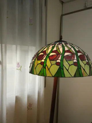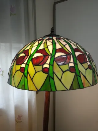 Elegante lámpara de salón con un diseño inspirado en el estilo Tiffany. Su pantalla combina vidrios de colores en tonos verdes y rojos, creando un ambiente cálido y acogedor. - Pantalla de cristal con diseño floral. - Base de madera.