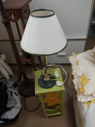 Conjunto de lámpara de mesa con pantalla y mesita auxiliar. - Mesita con diseño floral pintado. - Pantalla de lámpara de color blanco con detalles verdes.