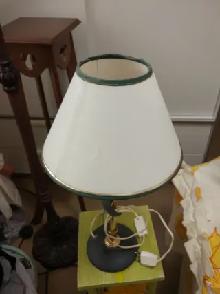 Preciosa lampara de pie de estilo vintage. Tiene una pantalla de tela beige y una estructura de madera en color verde. Es una pieza única que dará un toque especial a tu hogar. - Pantalla en tono beige. - Base y pie de madera torneada.