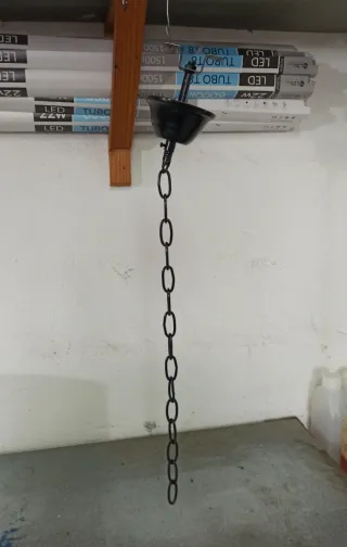 RESERVADO PARA ESTEL ⛔ Colgador florón rosetón y cadena. Todo de hierro, pintura negra brillo. Florón con tornillo regulable. Se puede electrificar. Para colgar lampara, globo o lo que tú quieras. Siempre que no sea algo pesado. Longitud total hasta el techo 65cm. Hago envíos por Wallapop o recoger en Cieza. Mira mis otros artículos de lámparas.