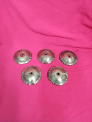 Lote de cinco platillos, platos, piezas, accesorios de chapa de latón con rosca metrica M10/100 para lamparas, candelabros o porta velas. Matizados, sin restaurar y solamente lacados en la cara inferior. Diámetro 9cm y alto 2 cm. Hago envíos por Wallapop o recoger en Cieza. Mira mis otros artículos de lámparas.
