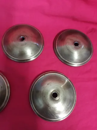 PRECIOS NO ⛔ NEGOCIABLE. Precio lote 28€. Precio unidad 8€. Cuatro platos, platillos, rosetones, piezas, accesorios de bronce fundido para lamparas, candelabros o porta velas. Restaurados en un taller orfebre y terminados con laca protectora. Con rosca metrica M10/100. Diámetro 9,5cm y alto 1cm. Peso unidad 110g. Peso total 440g. Hago envíos por Wallapop o recoger en Cieza. Mira mis otros artículos de lámparas.