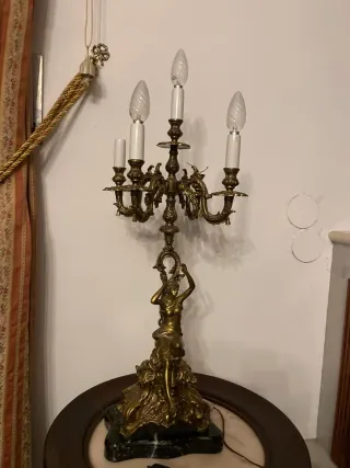 Elegante lámpara de mesa antigua con una base de figura y detalles ornamentales. - Elaborada en bronce con acabados dorados. - Base de mármol. - Diseño clásico con múltiples brazos para velas.