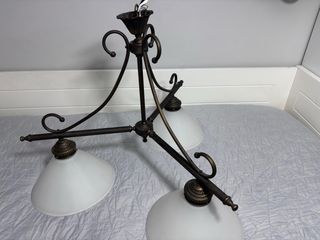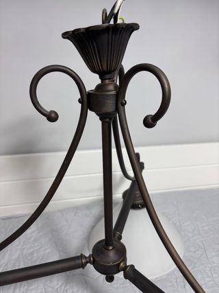 Elegante lámpara de techo con un diseño clásico. Está en perfecto estado y lista para darle un toque especial a tu hogar. - Estructura de metal con acabado en tono bronce. - Pantalla de cristal blanco.