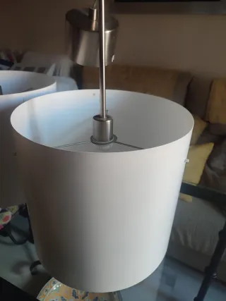 Lámpara de techo modelo Januari de Ikea. Su diseño moderno y elegante aportará un toque distintivo a tu hogar. Diámetro 36 cm, alto 33 cm. 15 euros por separado, 20 si te llevas las dos. - Estructura de metal. - Pantalla de color blanco.
