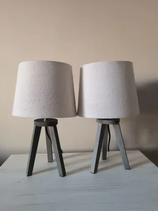 Conjunto de dos lámparas de mesita de noche con un diseño moderno y elegante. - Pantallas de tela en color blanco. - Bases de madera en color gris. - Estilo minimalista y actual.