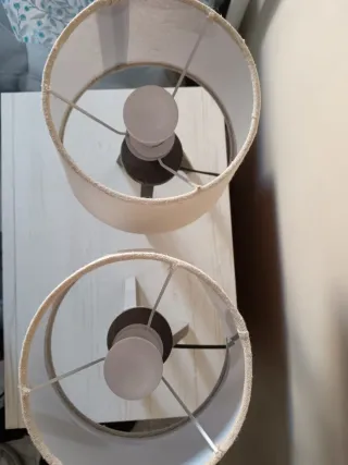 Conjunto de dos lámparas de mesilla de noche con un diseño moderno. - Base con acabado texturizado. - Pantalla de tela gris, tiene algunas arrugas pero se puede sustituir por otras campanas Entrego com bombillas funcionando