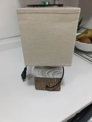 Lámpara de mesa con un diseño moderno y elegante, perfecta para cualquier mesita de noche o rincón. - Base con acabado imitación mármol y detalles en mimbre. - Pantalla de tela en tono beige.