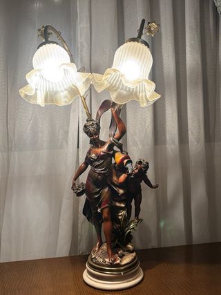 Elegante lámpara de estilo Art Decó con figuras decorativas. - Diseño con dos tulipas de cristal. - Base y detalles en metal. - Figuras de estilo clásico. Funciona perfectamente