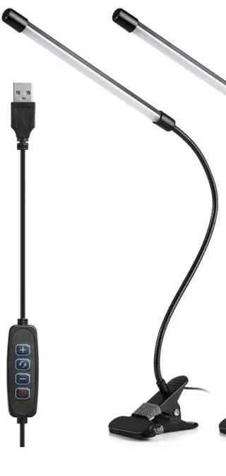 Lámpara de escritorio con brazo flexible y pinza para sujetar. - Iluminación LED. - Conexión USB. - Control de intensidad y modos de luz.
