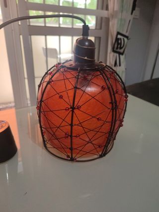 Conjunto de dos lámparas colgantes para techo. Su diseño combina un estilo moderno con un toque rústico. - Pantalla de vidrio con detalles en alambre. - Acabado en tonos marrones y anaranjados.