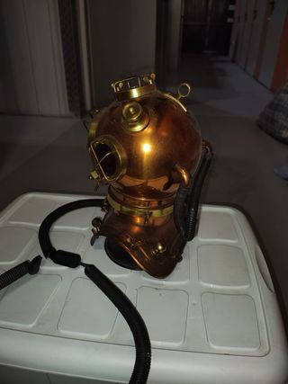 Original lámpara decorativa con diseño de cabeza de buzo antiguo. Un elemento único para dar un toque especial a tu hogar. - Acabado en tono dorado y detalles en rojo. - Fabricada con materiales de calidad.
