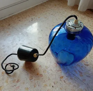 Lámpara retro años 70 con un llamativo globo de cristal azul. Con un diámetro de 17cm y altura unos 18.5cm contando la parte metálica. - Diseño esférico. - Acabado brillante del cristal.