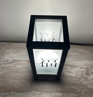 Añade un toque de estilo oriental a tu hogar con esta lámpara de mesa. - Diseño moderno y elegante. - Marco negro con panel translúcido. - Símbolo Fuku (Felicidad) en el panel. 2 lamparas.