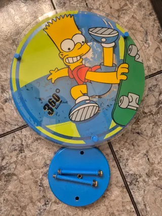 Lámpara decorativa con Bart Simpson de Los Simpson. El diseño circular muestra a Bart en su patineta. - Incluye base azul con soportes. - Diseño circular con Bart Simpson. - Texto '360º' visible.