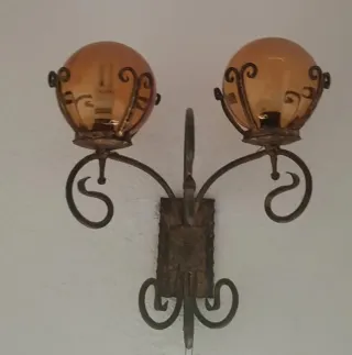Elegantes lámparas de pared con un diseño antiguo clásico. Combinando detalles metálicos con portalámparas de cristal. - Estructura principal de metal con acabado bronce y dorado. - Tulipanes de cristal ámbar. - Diseño de tres brazos (una de ellas) con un detalle floral central. Otra dos brazos decorativos en espiral con tulipas redondas Hago envíos y también entrego en mano en Baix Llobregat y Baix Penedés. Hagan ofertas individuales o por el lote completo razonables.