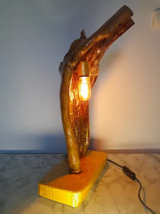 Lámpara artesanal hecha con una base de cemento unido a madera de raíz. La base es dorada con acabado barniz, y la madera está cruda, con detalles dorados y acabado en barniz. Incluye bombilla vintage. Es artesanal, no es perfecta 👌