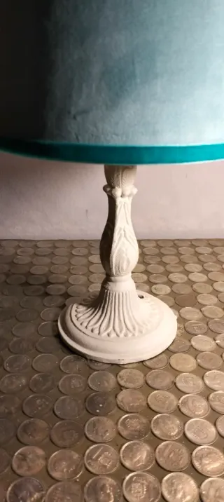 Elegante lámpara de mesa con un diseño clásico y un acabado cuidado. - Pantalla de terciopelo en tono azul verdoso. - Base de metal con detalles ornamentales en blanco.