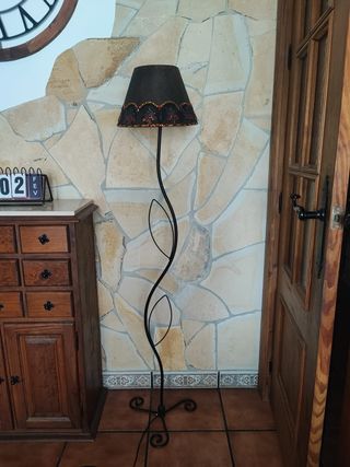 Elegante lámpara de pie con un diseño inspirado en el estilo moruno. - Base y pie de metal forjado. - Pantalla de tela con detalles decorativos. - Diseño curvo y orgánico en el pie.