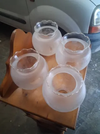 Conjunto de 8 tulipas de cristal para lámparas, con un diseño esmerilado y borde ondulado. El precio es por unidad Medidas 16x16 - Material: Cristal. - Color: Transparente y blanco esmerilado. - Borde decorativo ondulado.